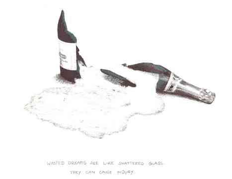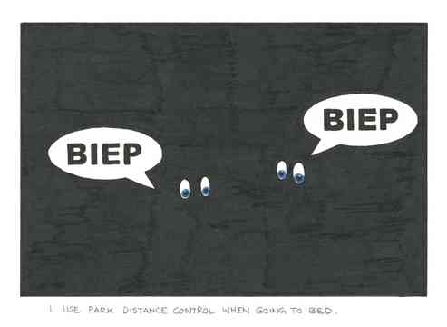 The drawings depict snapshots of everyday situations: banalities, highs and lows, expressions, impressions, or just experiences of life. The meaning of the drawings, especially those with inadequate or confusing slogans, is not apparent and obvious to the viewer. The viewer is invited to form his own opinion and make his own thoughts as well as to put himself in my place whilst gazing at my work. The use of ball-pens, conventional Eddingmarker, highlighters, pencils and metallic pens from the supermarket emphasises the relation to everyday life.